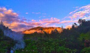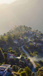 Golden mist kisses Chamoli’s lush hills under a dreamy sky in Uttarakhand’s serene lap.