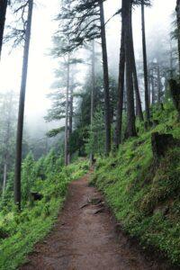 A peaceful forest path in Dehradun, wrapped in mist and whispering pine trees.